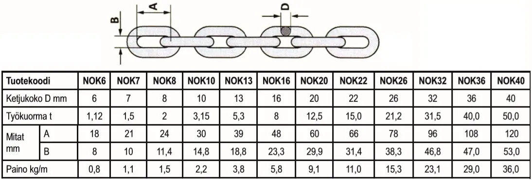 - Valmistettu SFS/EN 818-2 -standardin mukaisesti - Lyhythahloinen ketju - Lämmönkestävyys -40°:sta +200°:seen ilman työkuorman alennusta - Varmuuskerroin: 4:1