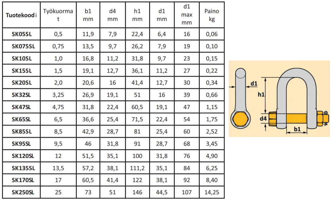 - Nostoihin hyväksytty suoramallinen sakkeli lukituksella - Täyttää standardin US FS RR-C-271 ja EN-13889 vaatimukset - Pintakäsittelynä sinkitys - Varmuuskerroin: 6:1 - CE-merkitty - Ei saa lämpökäsitellä
