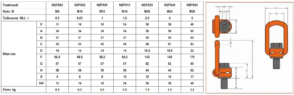 - Särötarkastetut luokituslaitosten tyyppihyväksytyt nostosilmukat - Työkuorma sama kaikilla nostokulmilla ja asennoilla - Silmukka kääntyy kuormituksen suuntaan - Pultti varustettu lukituksella - Saatavana myös tuumakokoina - Valmistettu EU-direktiivin mukaisesti - Täyttää standardin SFS-EN ISO 3266 vaatimukset - CE-merkitty - Pintakäsittelynä maalaus - Varmuuskerroin 4:1 - Ei saa lämpökäsitellä - Saatavana myös pitkällä pultilla