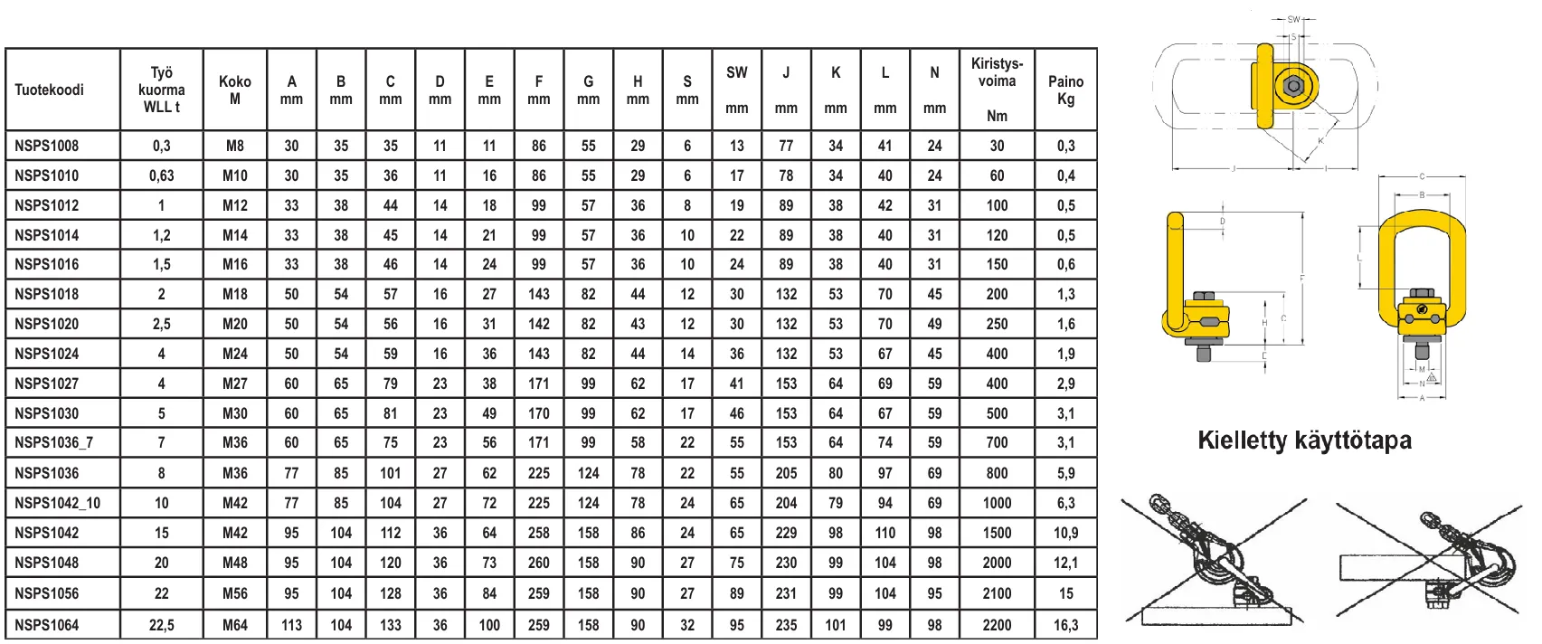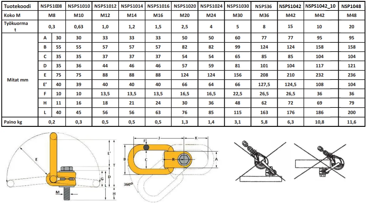 - Särötarkastettu luokituslaitosten tyyppihyväksymä nostosilmukka - Työkuorma sama kaikilla nostokulmilla ja -asennoilla - Silmukka kääntyy kuormituksen suuntaan - Pultti varustettu lukituksella - Saatavana myös tuumakokoina - Valmistettu EU-direktiivin mukaisesti - Täyttää standardin SFS-EN ISO 3266 vaatimukset - CE-merkitty - Pintakäsittely: maalaus - Varmuuskerroin: 4:1 - Ei saa lämpökäsitellä - Saatavana myös pitkällä pultilla
