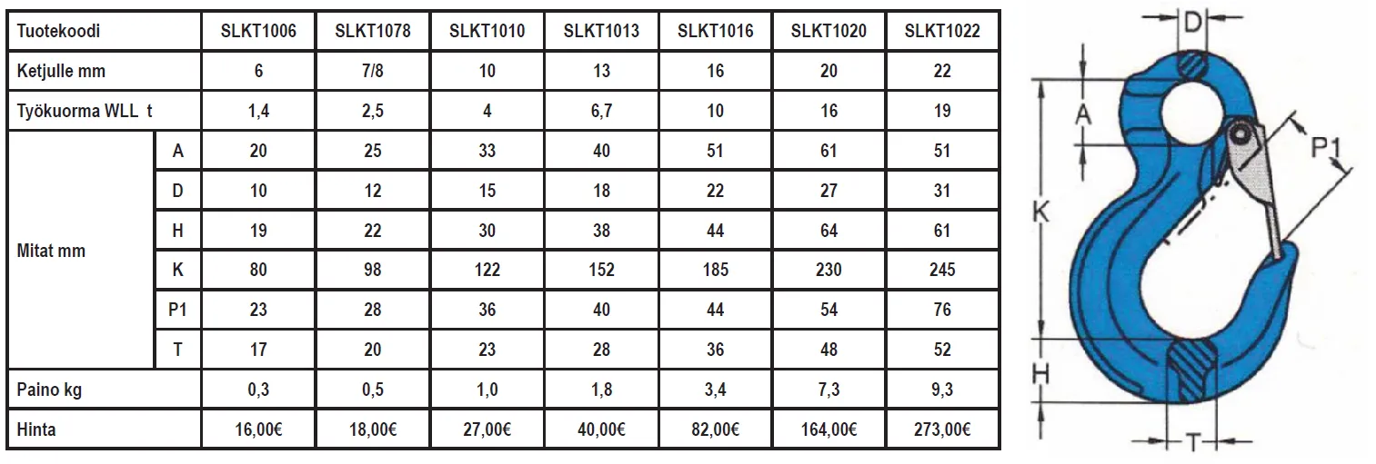Salpakoukku 16-10 10,0T on suunniteltu raskaiden kuormien, kuten puutavaran, nostamiseen ja siirtämiseen, kantavuudeltaan jopa 10 tonnia. Valmistettu korkealaatuisesta teräksestä, se on pitkäikäinen ja kestävä myös kovassa käytössä. Koukun muotoilu mahdollistaa kuorman helpon kiinnittämisen ja irrottamisen, nopeuttaen työprosesseja. Tuote on testattu ja sertifioitu, joten sen turvallisuus ja luotettavuus ovat taattuja.