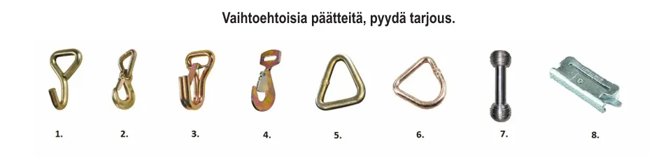 - Kevyeen sidontaan peräkärryissä, kattotelineissä jne. - Molemmissa päissä teräksiset kaksoislankakoukut - Nauhan leveys on 25 mm ja murtolujuus 1200 kg (LC 400 kg) - Pituus: 0,4 + 4,6 kg - Nauhan materiaali 100 % polyesteriä - Pakkauskoko 50 kpl/laatikko - Väri: musta - Paino: 0,5 kg